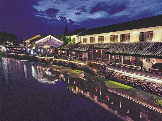这是9月19日拍摄的夜色中的沈荡镇老街(无人机照片)。
