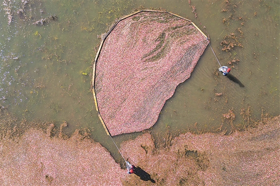 9月21日,在黑龙江抚远市蔓越莓种植基地,工作人员在水中采收蔓越莓(无人机照片)。当天,“庆农业丰收 享美好生活”蔓越莓丰收节在我国“东极”抚远市举行,4200亩的抚远市蔓越莓种植基地迎来采收季。