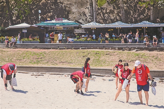 当地时间9月20日,数百名志愿者在巴西里约热内卢多处海滩参加世界清洁日活动。该活动旨在推广可持续理念,呼吁公众通过日常行动守护地球,提升社会对环境保护和循环经济的关注。图为志愿者在巴西里约热内卢科帕卡巴纳海滩上捡拾垃圾。新华社记者 王天聪 摄
