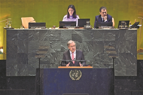 图为当日,在位于纽约的联合国总部,联合国秘书长古特雷斯在纪念北京世妇会30周年高级别会议上讲话。