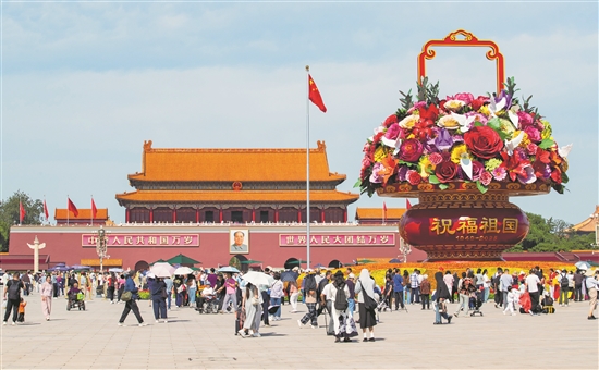 当日,“祝福祖国”巨型花篮亮相北京天安门广场。花篮顶高18米,篮盘直径12米。篮内选取了美好寓意的花卉,其中荷花寓意“和和美美”、橄榄枝寓意“荣耀和平”等,结合和平鸽元素,体现“和平发展、欣欣向荣”。本报记者 王伟伟 摄