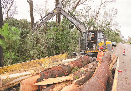 9月25日,在广东阳江市阳东区的228国道,公路局工作人员在清理倒伏树木。