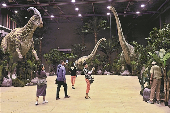 9月25日,江苏省无锡市国家数字电影产业园,游客在仿生恐龙电影道具前拍照。