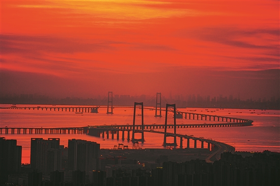 广东中山,当晨光刺破海平面,深中通道索塔的钢构被染成金红色,斜拉索在霞光中编织出光的琴弦。视觉中国 供图