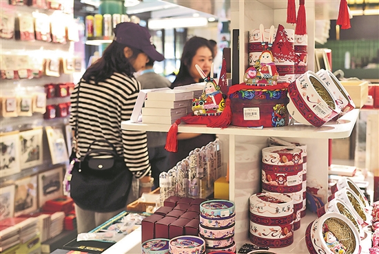 9月24日,2005北京文化论坛“基于中华优秀传统文化视角解读新质生产力”专业沙龙在观中・中轴线在地文化博物馆举行,这里曾是元代古建宏恩观,是北京中轴线北沿延线第一座压线建筑。如今它已成为连接历史与当下、在地与世界的文化地标。图为参加沙龙的嘉宾在坐落于此的北京中轴线主题邮局挑选文创产品。本报记者 王羡茹 摄