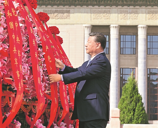 9月30日上午,党和国家领导人习近平、李强、赵乐际、王沪宁、蔡奇、丁薛祥、李希、韩正等来到北京天安门广场,出席烈士纪念日向人民英雄敬献花篮仪式。这是习近平整理花篮上的缎带。新华社记者 李响 摄