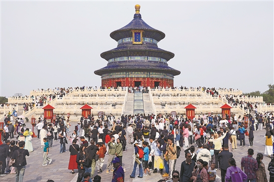 10月7日,游客在北京天坛公园参观游览。