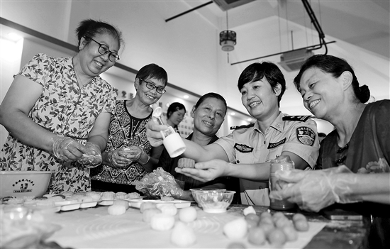 日前,浙江省台州市路桥区派驻新保村的第一书记、桐屿派出所驻新保村的社区民警黄文雅,组织村里群众一起制作“平安月饼”。