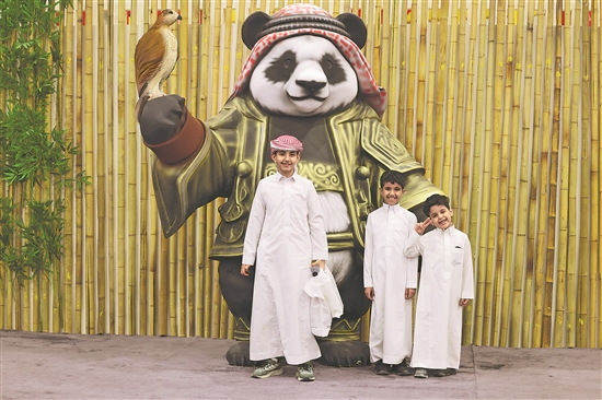 近日,沙特儿童在首次设立的中国展区门口的熊猫雕塑前合影留念。新华社记者 王海洲 摄