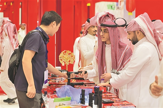 近日,沙特观众在首次设立的中国展区参观游览,购买户外运动装备。新华社记者 王海洲 摄