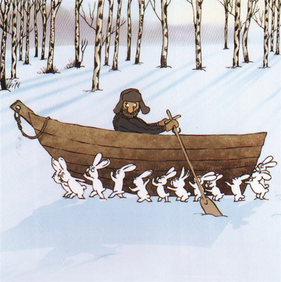 “雪中行舟”常是狗拉耙犁飞驰在白雪皑皑的广袤大地上,可是这里却是兔子肩负重任拖拉木船前行。这正是:齐心协力泰山移。