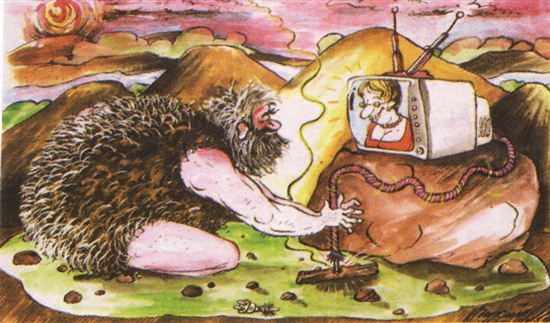 现代化的设计进入远古时期会是什么样子?如用钻木取“电”观看银屏节目,便忍俊不禁,这种穿越时空的构思值得一试。