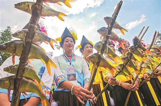 10月9日,广西柳州市融水苗族自治县红水乡高文苗寨举办传统“烧鱼节”,四乡八寨各族同胞和外地游客欢聚一堂,在烧烤禾花鱼、跳苗舞和芦笙踩堂等活动中,感受农耕文化魅力,享受丰收喜悦。本报通讯员 龙涛 摄