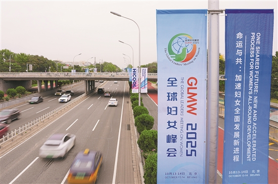 图为10月12日在北京街头拍摄的全球妇女峰会道旗。
