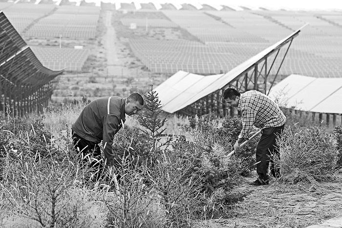 10月9日,内蒙古自治区鄂尔多斯市达拉特旗光伏发电应用领跑基地,工作人员正在铺设电缆。鄂尔多斯市是“三北”工程黄河“几字弯”攻坚战的最前线。近年来,当地积极探索“光伏+”模式发展特色产业,探索“以工代赈”模式,发动当地群众参与防沙治沙生态工程建设,有效提高生态建设质量和群众收入。本报记者 王伟伟 摄