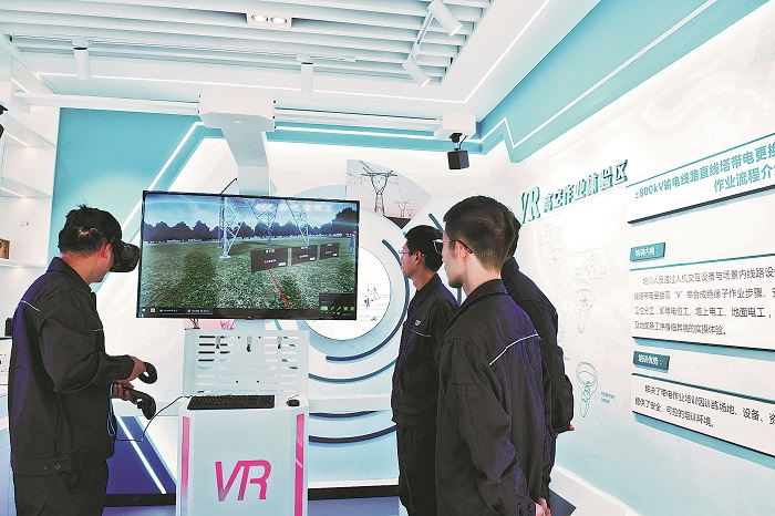 国网湖北送变电公司以仿真模拟、劳模教学等形式不断夯实班组青年员工技能基础。图为10月10日,该公司带电作业班班长王明(左)借助VR体验设备,向青年员工讲授高空作业技巧。郭晖 摄