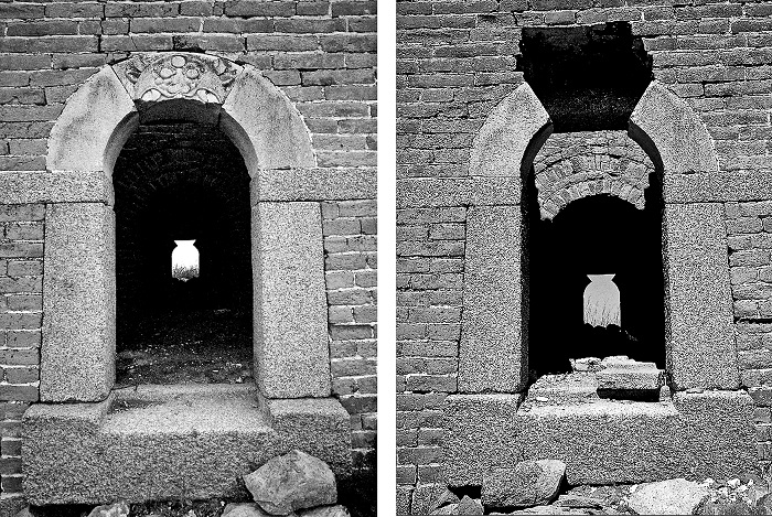 左:2004年拍摄的唐子沟长城的一处敌楼,雕刻成怪兽面目的拱顶石很完整。右:2005年,同一地点拍摄的照片中,拱顶石已消失不见。