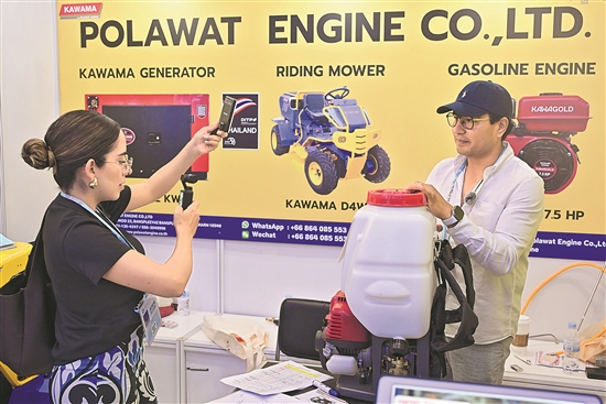 图为10月15日在广交会进口展的泰国企业展区,参展人员在介绍产品。