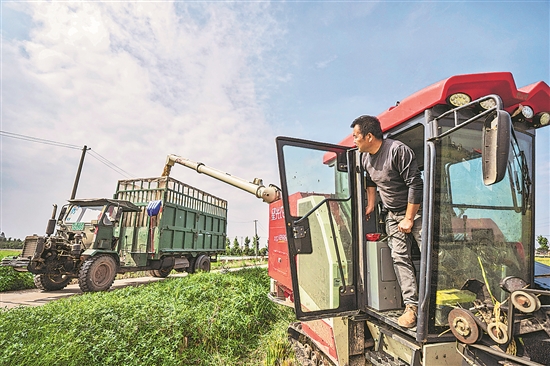 10月15日,在位于洞庭湖腹地的湖南省益阳市南县南洲镇育才村,农机手将收获的水稻装入运粮车。