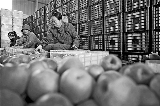 工人在甘肃省陇南市礼县永兴镇一处苹果仓库内分拣苹果(10月14日摄)。