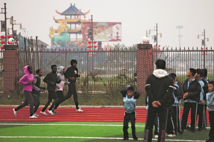 10月15日清晨,来自肯尼亚的学员在河北吴桥杂技艺术学校的操场上晨跑,不远处就是当地的著名景区吴桥杂技大世界。