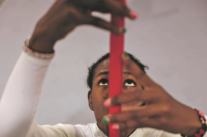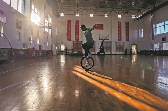 10月16日,来自肯尼亚的丹尼斯正在体育馆练习独轮车。