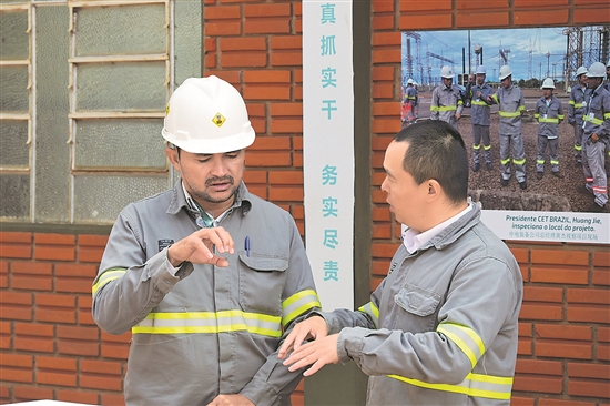 近日在巴西伊瓜苏,中巴工作人员在伊泰普直流改造项目现场交流。 新华社记者 陈昊佺 摄