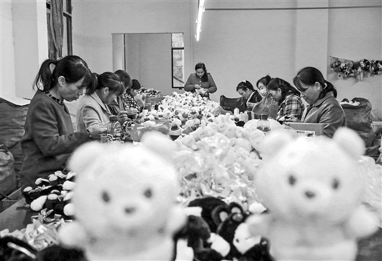 10月21日,湖南省永州市新田县中山街道舂陵社区星瑞玩具制造厂,工人在赶制玩具订单产品。