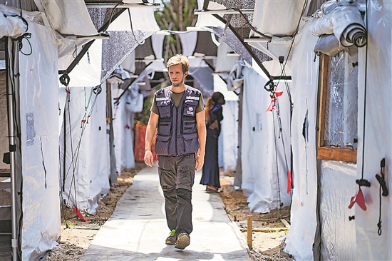 图为近日一名世界卫生组织的工作人员走在刚果(金)开赛省布拉佩卫生区的埃博拉治疗中心内。