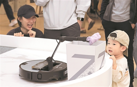 在该购物中心内,一家中国企业的扫地机器人专柜前,带有机械臂功能的石头科技品牌扫地机器人吸引了大家的目光。