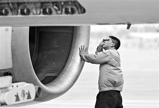 图为10月26日,在福州长乐国际机场,工作人员在检查飞机安全情况。