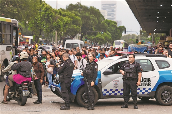 据巴西里约热内卢州警方当地时间10月28日通报,警方在当日清晨开始的大规模剿匪行动中击毙至少56名嫌疑人,逮捕81人,另有4名警员殉职。图为军警在街头维持秩序。新华社/巴西通讯社