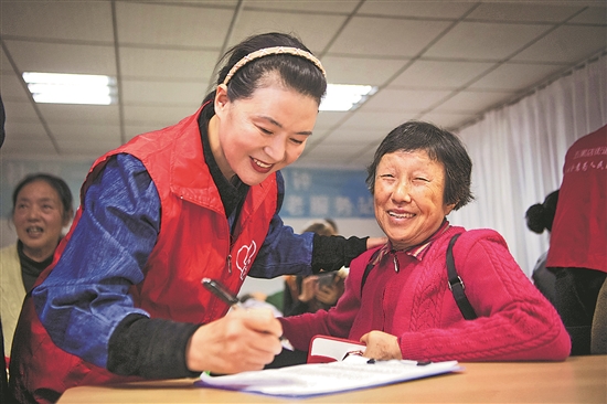 10月29日,在重庆市江北区五里店街道渝能阳光社区“享老驿站”,志愿者与老年居民交流并做健康信息记录。