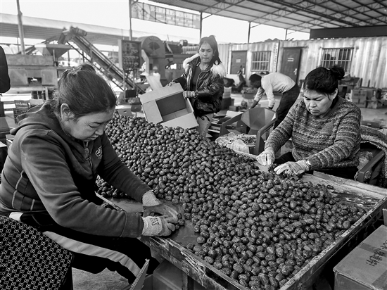 眼下,新疆各地红枣陆续进入丰收季,特色林果产业链上的采摘、分拣、打包等岗位也迎来用工高峰期。图为阿克苏地区新疆红旗坡农贸物流园里的工人忙着分拣红枣,在满足当地季节性用工需求的同时,也拓宽了村民增收渠道。本报记者 吴铎思 摄