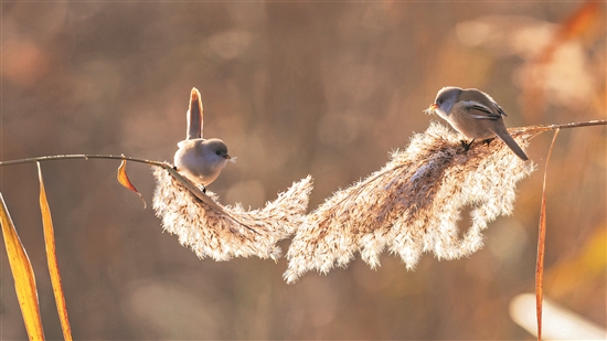 10月25日,黑龙江省大庆市龙凤湿地自然保护区,文须雀在晨光芦苇荡中觅食、嬉戏。这群体长不足15厘米的小家伙,最爱在清晨和黄昏活动。池世永 摄/中新社