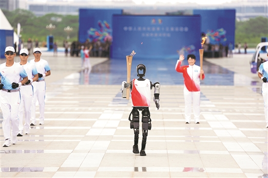 11月2日,火炬手人形机器人“夸父”在传递火炬。 当日,中华人民共和国第十五届运动会火炬传递启动仪式在深圳举行。