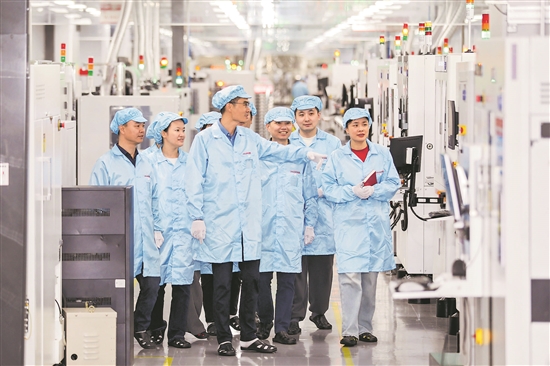 10月27日,位于福建省福州市仓山区的锐捷网络股份有限公司数字化智能工厂内,福建省数字工匠孙广超(左三)与青年工程师交流单板车间的全自动化生产工艺。