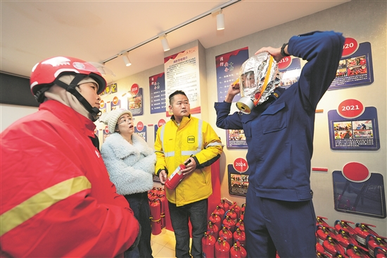 11月6日,一支由外卖配送员、快递员、网约车司机等新业态群体与社区志愿者应急队伍成员组成的“百安骑士”消防队,在天津市和平区劝业场街百货大楼社区成立。消防工作人员为他们现场培训并为队员发放便捷式灭火器,鼓励他们成为社区治理的“移动探头”。图为消防工作人员为大家培训。本报通讯员 沈岳 摄