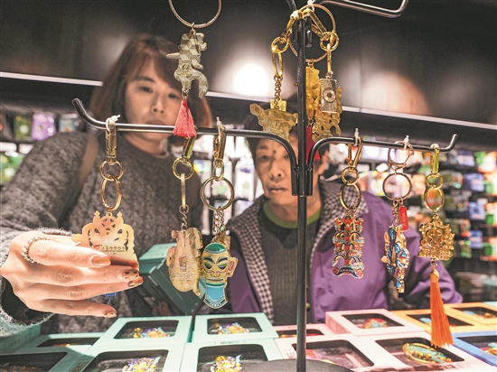 图为游客在四川省广汉市三星堆博物馆内的文创商店选购文创产品。