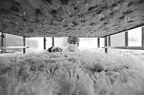 11月5日,在甘肃省定西市临洮县一家菊花加工企业,工人准备烘干采摘的金丝皇菊。