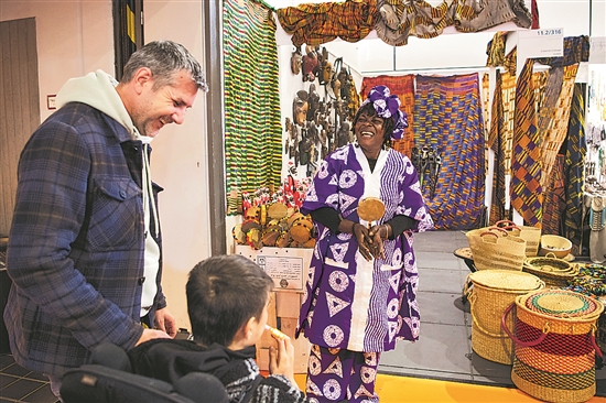 近日,“柏林巴扎”国际工艺展开幕,来自世界各地的约500家制造和零售商参展。本届展会将持续至11月9日。图为近日人们在德国柏林举办的“柏林巴扎”上和加纳展商交流。