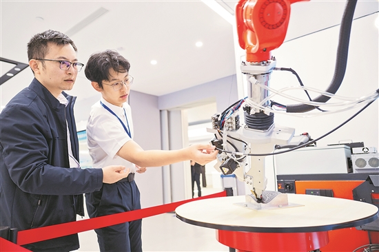 有“中国光谷”之称的武汉东湖新技术开发区,是国家自主创新示范区。近年来,该开发区聚焦高水平科技自立自强,推动“中国光谷”迈向“世界光谷”。图为11月6日,在武汉产业创新发展研究院,工作人员展示增材制造机器人。新华社记者 伍志尊 摄