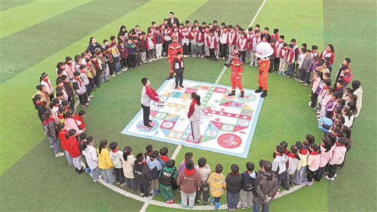 11月7日,在江苏省淮安市洪泽实验小学,学生在体验趣味消防飞行棋游戏。全国消防日将至,各地开展丰富多彩的消防宣传教育活动。 新华社发(殷潮 摄)
