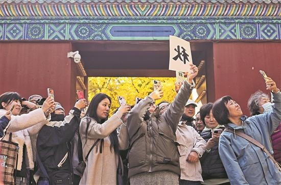 11月4日上午,北京地坛公园,游客在银杏大道前拍照,用金黄银杏叶填满镂空的“秋”字,留住北京最美的季节。时至深秋,北京各大公园呈现黄、橙、红、绿叠加的多彩景色,彩叶树种搭配园林古建、芦苇残荷、碧水远山,共同形成历史名园绚烂多彩的独特秋季美景。