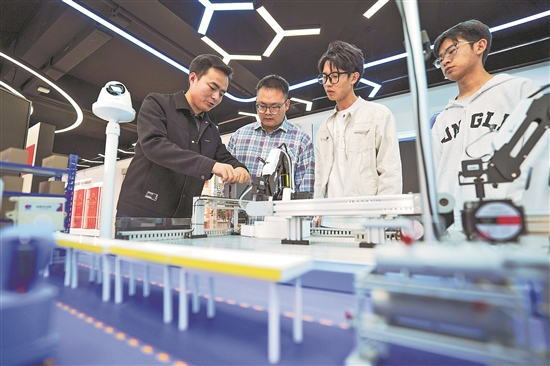 10月29日,郑棋元(左一)在云南技师学院利用沙盘模型与学生探讨研发项目。