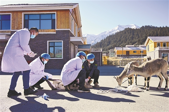 11月10日,在救护繁育站,工作人员为岩羊打疫苗。