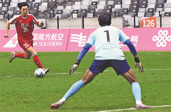 11月11日,河北队球员陈天乐(左)在比赛中带球突破。新华社记者 郝源 摄