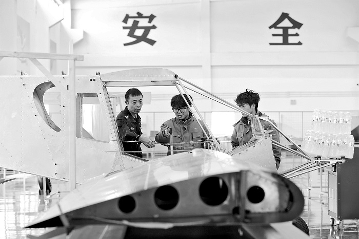 11月11日,江苏省宿迁市公安局苏宿园区分局民警在一家航空科技公司了解生产经营情况,宣传安全防范知识。为护航低空经济高质量发展,优化法治化营商环境,当地民警深入辖区飞机制造企业,开展征求意见建议、排查安全隐患等工作,携手筑牢企业安全生产网。本报通讯员 王力 摄