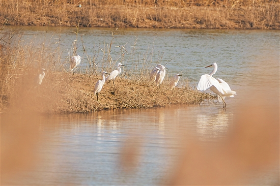 11月13日,在黄河三角洲国家级自然保护区,白鹭在湿地休憩。