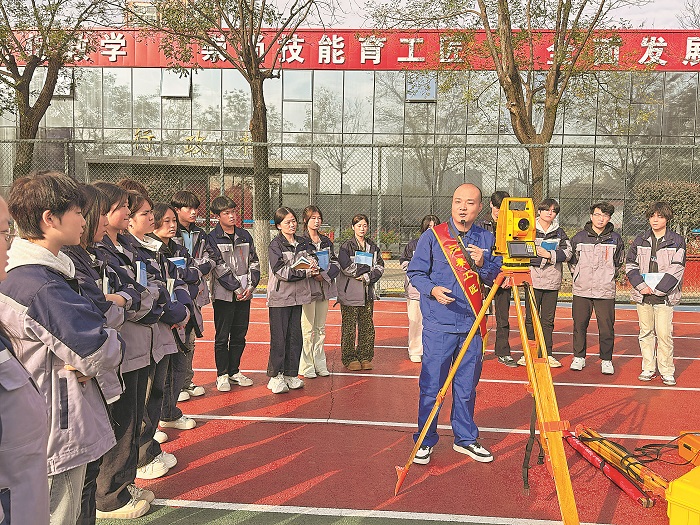 聘任仪式结束后,中铁七局集团西铁工程公司精测队副队长、三秦工匠李国强作为受聘教师,拿着全站仪等测量工具来到学校操场,学生们围在他周围认真听他授课。